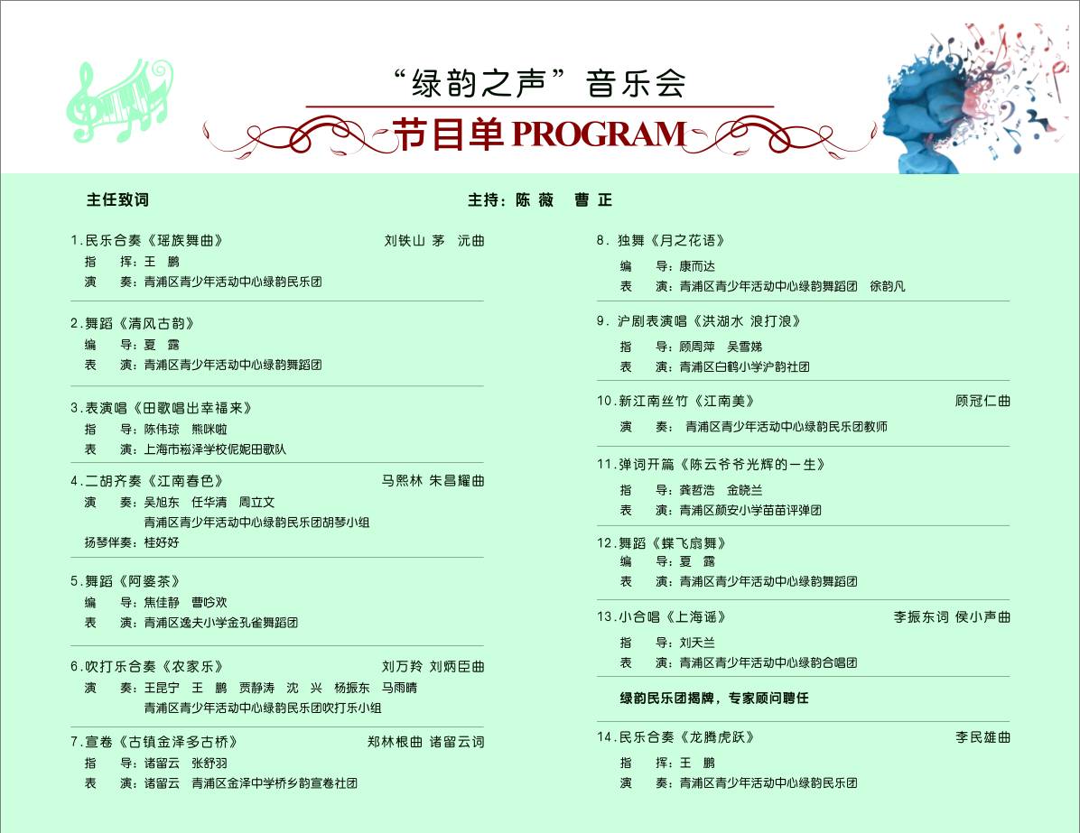 2017年12月16日,由青浦区青少年活动中心主办的“绿韵之声”青浦乡土音乐展示暨绿韵民乐团成立音乐会在青浦高级中学音乐厅隆重举行。本次音乐会为“2017上海市学生美育活动项目”展示内容之一。