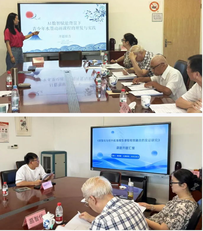 开题会由活动中心教师发展处倪俊老师主持,有课题开题报告介绍、答辩交流、专家点评等环节。2025年上海市校外课外、青浦区教育科研立项有四项课题。分别是,25年立项的上海市校外课外教育科研一般课题:美术组朱婕老师主持的《AI数智赋能背景下青少年水墨动画课程的开发与实践》;青年课题:科技组陈世豪老师主持的《数智化与校外航海模型课程有效融合的实证研究》;25年立项的青浦区教育科研两项青年课题:科技组吴嘉佩老师主持的《“青韵创印”:基于青浦水乡文化的校外少儿3D打印特色课程开发和实践研究》,以及科技组项晨健老师主持的《化赛为学:青浦区青少年“科学思创挑战活动”中开展项目化学习实践的案例研究》。