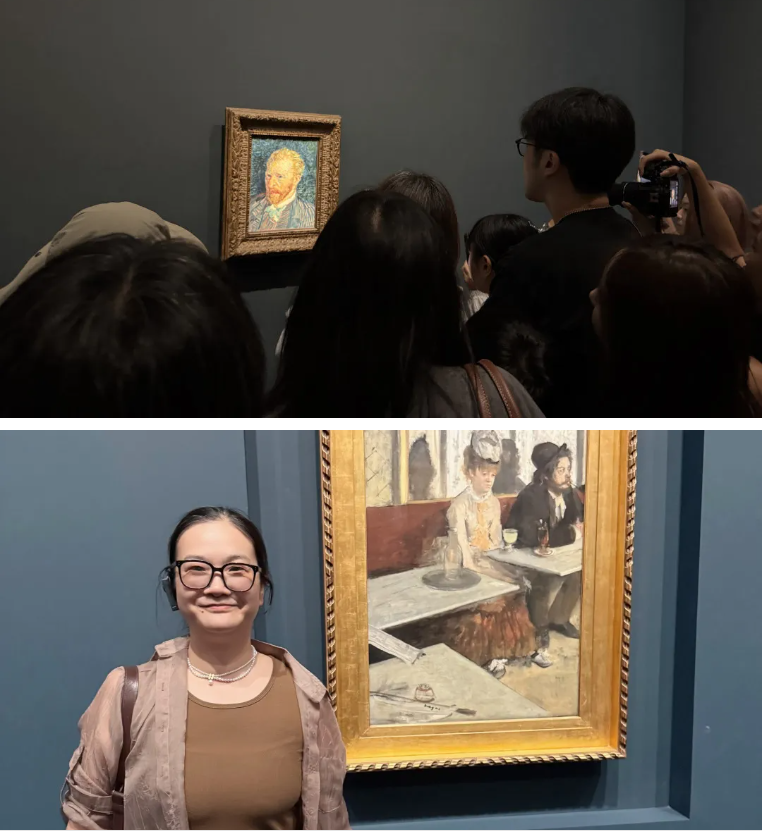 在“缔造现代——奥赛美术展”展区,大家聚焦印象派、后印象派等现代艺术流派的代表作品,从莫奈笔下光影的灵动变幻,到梵高画作中强烈的色彩张力,逐幅分析作品的色彩搭配逻辑、笔触表现手法与时代背景内涵。不少教师拿出笔记本或手机,认真记录画作细节与创作灵感,时而俯身观察画布肌理,时而轻声交流对艺术风格演变的理解,学习氛围浓厚。