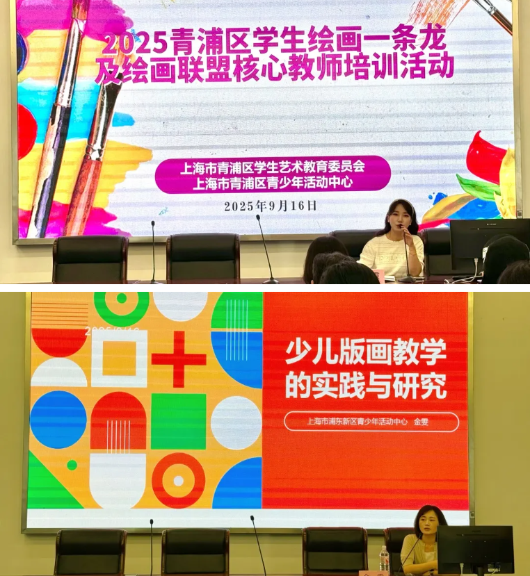 2025年9月16日,青浦区绘画一条龙及学生绘画联盟核心组及骨干教师培训活动如期举行。本次活动由青浦区学生绘画联盟主持人张秋霞老师主持,特邀浦东区青少年活动中心金雯老师带来《少儿版画教学的实践与研究》专题讲座,为与会教师开启了一场关于版画艺术教育与创新的思想盛宴。