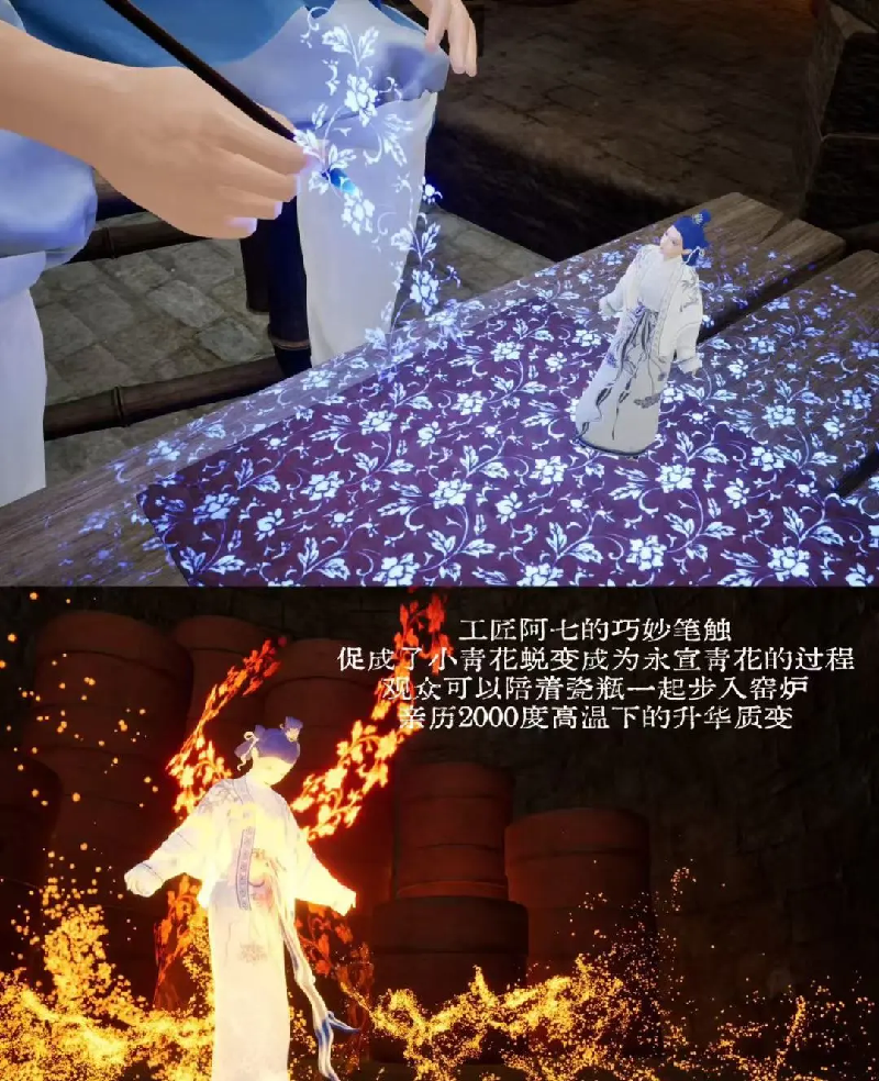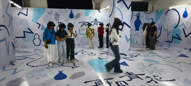 本展览是2025年第36届上海旅游节项目之一,以VR数字科技为笔,重现永萱青花的艺术风华。观展人员戴上VR眼镜后,在数字人“小青花”的引导下“走进”明永乐年代,直观目睹了青花瓷的发展脉络——这一器物始于唐宋、成熟于元代,工艺在明宣德时期达到顶峰,早已成为极具辨识度的中国象征符号。