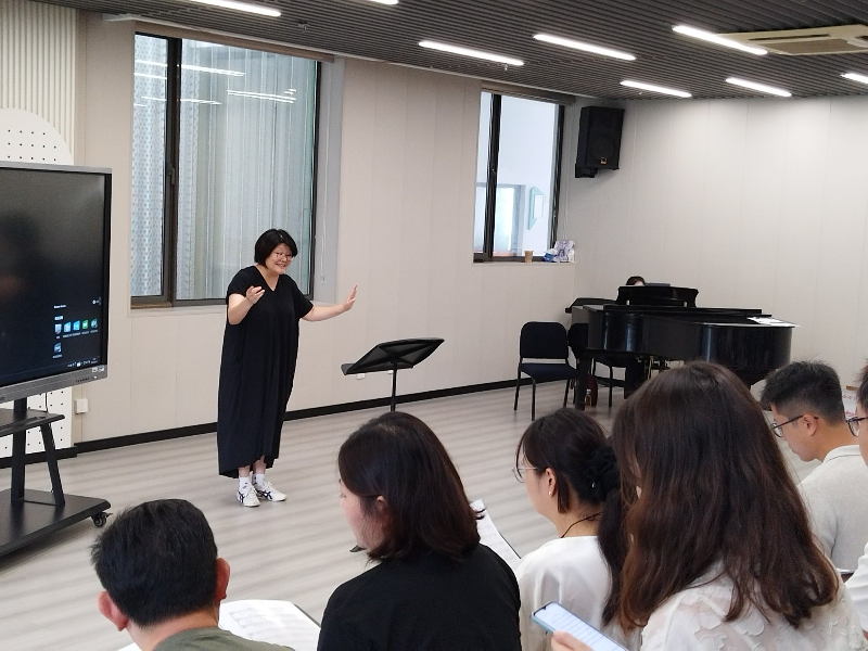 活动中,徐亮亮老师围绕“只有老师们持续输出,才能让合唱的能力走进孩子心里”这一核心理念,结合《田野的呼唤》《Seeds》两首适合初始阶段学生的作品开展实操教学指导。针对《田野的呼唤》,她重点解析各声部节奏特征与配合逻辑,指导教师精准把握A段切分节奏、休止符演唱要点,以及B段声部对唱、问答式配合技巧;针对英文作品《Seeds》,则聚焦“清晰发音与连贯旋律平衡”,细致讲解辅音咬字、元音口腔控制等发音规范,以及长音“下叹吸气”的演唱方法。